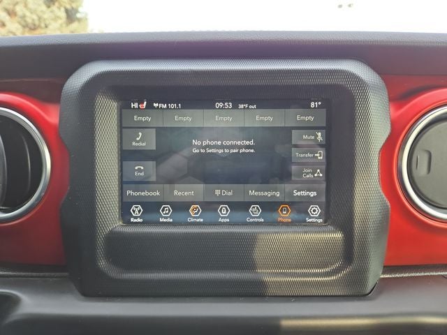 Sit in our Rubicon cabin and try to suppress a smile! The Cold Weather Pack features supportive heated black-cloth seats with a Rubicon logo and red accent stitching, a heated leather-wrapped steering wheel, dual-zone automatic climate control, pushbutton ignition, and 12V/115V power outlets. Leave the pavement behind but take your world with you, thanks to Uconnect® technology with a 7-inch touchscreen, Android Auto®/Apple CarPlay®, Bluetooth®, voice recognition, and an eight-speaker sound system.